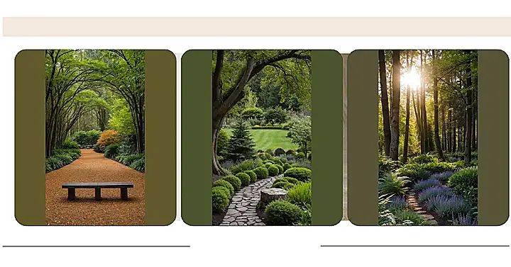 This forest garden situation looks like nature threw a seriously epic party but also hired a professional organizer. Check out that path! It winds through perfectly puffed-up bushes like a VIP entrance to the main event. You can almost hear the big trees on the left whispering secrets about the best spots for napping, while the tiny plants along the edge are probably just arguing about who gets the most sunlight.