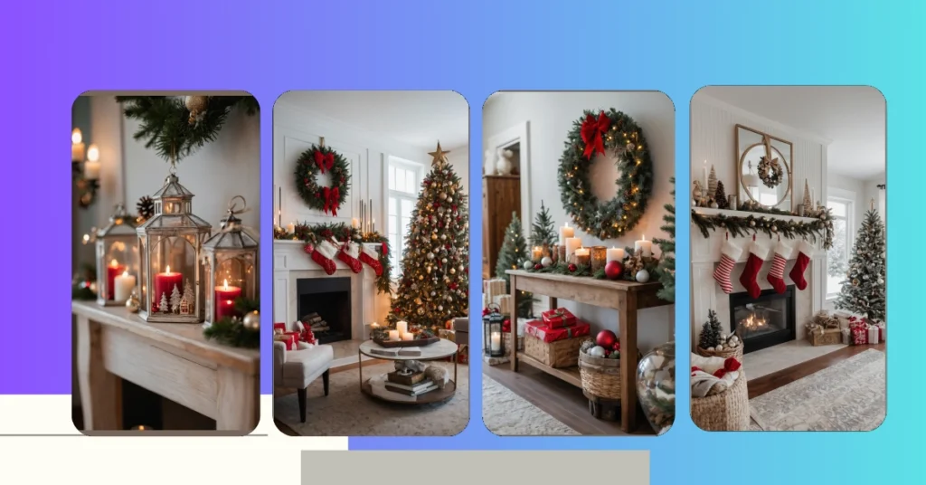 Step right into a scene so cozy, it practically screams, ‘Grab a blanket and some hot cocoa!’ This Christmas living room isn’t just decorated; it’s practically giving off warm hugs thanks to these awesome lanterns on the mantelpiece. They’re like little glowing apartment buildings for candles, each one shining a friendly, flickering light that could probably melt even the iciest winter blues. Seriously, these aren’t just decorations; they’re tiny mood-setters that make every evening feel like the start of a holiday movie marathon, complete with all the comfy vibes.