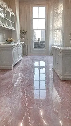Take a peek at this room – isn’t that floor just ridiculously shiny? It’s so smooth and glossy you can practically see your future (and definitely that giant chandelier!) reflected perfectly, making the whole place feel super grand. This isn’t some rare, expensive stone you’re looking at; it’s the incredible magic of epoxy flooring, which basically turns your plain old floor into a custom masterpiece. It’s like giving your room a superhero cape, but for the floor, complete with a fantastic marbled pink design that’s way cooler than any school hallway.