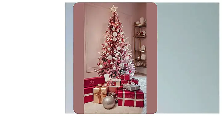Who knew a Christmas tree could be so utterly fabulous? This isn’t just any old evergreen; it’s practically a superstar with its snowy white branches and a dazzling glow that screams ‘main character energy.’ Peeking out from the frosty tips, you’ll spot gorgeous teal, soft pink, shimmering gold, and even a hint of lavender ornaments, looking like they were hand-picked by Barbie herself for her ultimate holiday glam party. It’s got that perfect mix of cozy festive sparkle and straight-up chic style, ready to make any room (or screen!) feel like a scene from a holiday movie where everyone gets a perfect gift and has amazing hair.