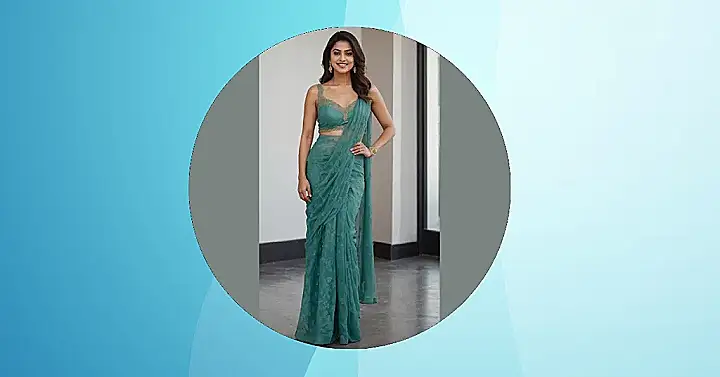 Getting a saree and blouse combo that fits perfectly and lets you move freely without tripping over the pleats is practically a superpower itself! This gorgeous teal ensemble, with its cool subtle patterns, looks super comfy yet totally chic. The way it drapes makes her look effortlessly confident, like she just decided, ‘Today, I’m going to stun everyone with my amazing fashion sense and still manage to get ice cream without spilling on my fancy threads.’ It just proves that a well-chosen outfit isn’t just about the fabric; it’s about the feeling it gives you – making you ready for anything, from a fancy party to accidentally bumping into your crush. Plus, who knew this shade of teal could be so absolutely stunning?