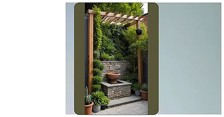Having a small outdoor space doesn’t mean you can’t have awesome features either. See that wooden frame? That’s a pergola, basically a fancy trellis, giving vines a place to hang out and look cool while also providing some shade. And the little fountain? It adds a nice burbling sound that makes everything feel super peaceful, even if your neighbour is mowing their lawn at 7 AM. It’s all about packing personality and cool features into a small package, turning a tight spot into your personal green oasis.