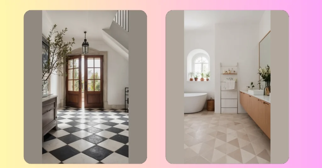 Forget those boring single-color floors! This checkerboard design, still rocking strong for 2026, is basically the equivalent of wearing stripes and polka dots at the same time, but for your house. It’s bold, it’s fun, and it definitely keeps your brain on its toes – just try walking across it after midnight without feeling like you’re suddenly in a retro video game. Good luck finding a dropped crumb on the dark tiles, though; that’s the ultimate hide-and-seek challenge!
