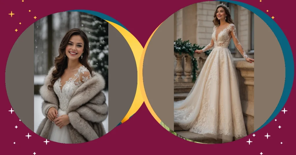Let’s be honest, getting married in a winter wonderland beats sweating it out in a summer garden any day, especially when your dress options are this cool! Forget worrying about sunburn on your big day; instead, you get to rock a gorgeous gown with sleeves, maybe even a cozy fur cape like hers, and a super festive head wreath that practically screams ‘holiday cheer.’ This look proves that Christmas wedding dresses aren’t just pretty; they’re smart, keeping you warm while you sparkle brighter than any Christmas tree lights. Plus, who wouldn’t want snow falling gently as their confetti?