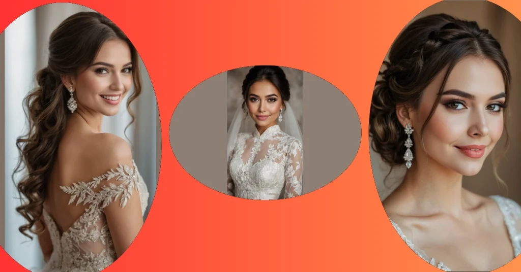 Her hairstyle is such a cool mix of fancy and breezy, and it totally complements her dazzling earrings and that intricate lace dress. It’s almost like her hair decided to have its own little celebration, all bouncy and beautiful, making sure she looks absolutely incredible for her big day. You can practically feel the “happily ever after” vibes jumping out of the picture! This isn’t just hair; it’s a statement piece that whispers tales of romantic slow dances and dreamy first kisses, making her look effortlessly stunning.