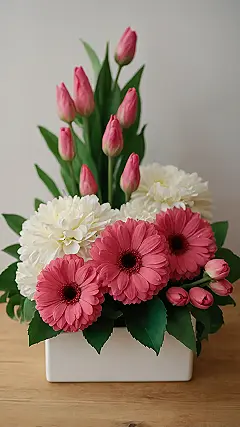 This flower arrangement looks like a perfectly coordinated dance team, or maybe a super chill study group, where everyone knows their role. You’ve got the tall, elegant pink tulips in the back, probably whispering secrets and making sure they don’t block anyone’s view. Then there are those fluffy white flowers, acting like the supportive crowd, providing a soft cloud for everyone to shine against. And front and center? Those vibrant pink gerberas, basically the life of the party, radiating pure joy and probably telling everyone the funniest jokes. It’s like they all got together and decided, “Let’s make this room instantly happier!”