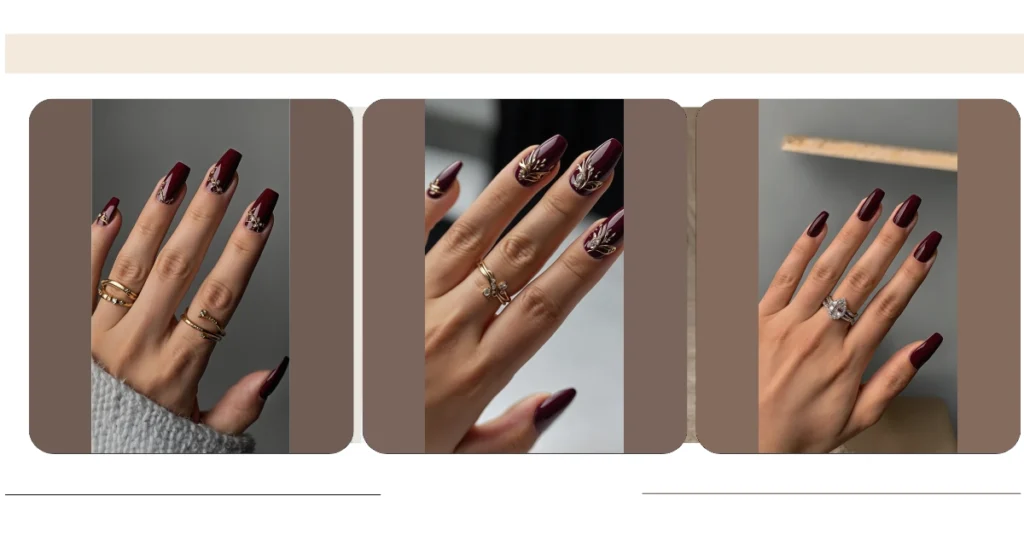 But wait, there’s more to this hand than just fabulous nails! Check out those sparkly rings – they’re practically throwing a party on her fingers. With the stunning maroon nails as the backdrop, those dazzling diamonds just pop even more, making the whole look super chic and a little bit glamorous. It’s like the nails said, “We’ll bring the sophisticated color,” and the rings said, “We’ll bring the bling!” Together, they prove that a great manicure isn’t just about the color, but how it works with your whole vibe, turning your hand into a tiny, stylish masterpiece.