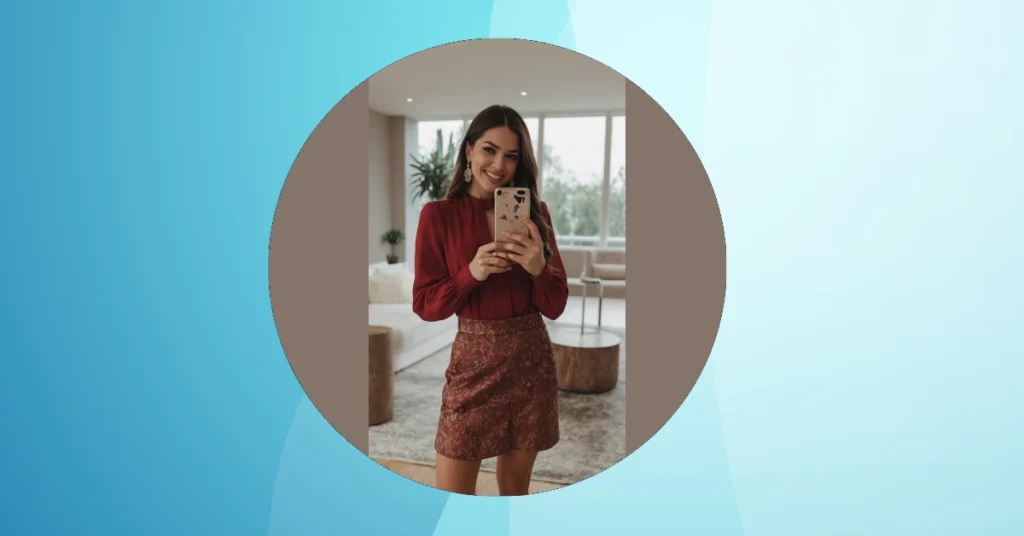 Now, let’s talk about the rest of this holiday party masterpiece! That dark reddish skirt is super chic, like something out of a cool fashion magazine, and pairs perfectly with those tall, sleek boots. They’re probably great for keeping your legs warm if you’re dashing from party to party in chilly weather, or just for making a grand entrance (and maybe hiding that one awkward dance move you do). And don’t forget the matching bag – perfect for stashing your phone for all those holiday selfies or, you know, a secret snack if the main party food isn’t cutting it. It’s an outfit that says, “I’m ready to celebrate, look fabulous, and maybe also escape gracefully if Aunt Carol starts asking about my life plan.”