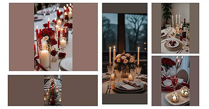 Feeling fancy tonight? This dinner table totally screams ‘special occasion’ louder than your alarm on a Monday morning! Look at those flickering candles – they’re not just for light, they’re basically tiny mood generators, making everything glow with a warm, cozy vibe. It’s like someone decided to turn down the harsh overhead lights and declare, “Tonight, we dine like royalty, but, like, super chill royalty!” All those red and pink roses, scattered petals, and even a single rose on each plate just take the effort level from ‘zero’ to ‘hero’ in seconds.