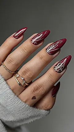 These nails are definitely serving up some serious style, looking sharp enough to write your homework with (but maybe stick to pens, just to be safe!). With their deep, sparkly red and those awesome silver designs, they’re like a secret magic spell for your fingertips. We’re talking ‘coffin nail inspo’ here, but instead of spooky, they’re totally chic and ready for any school dance or even just acing your next presentation. Who knew nails could look so fierce and festive all at once? They totally prove that being a little bit edgy can still be super elegant, especially with those cool gold rings adding extra sparkle.