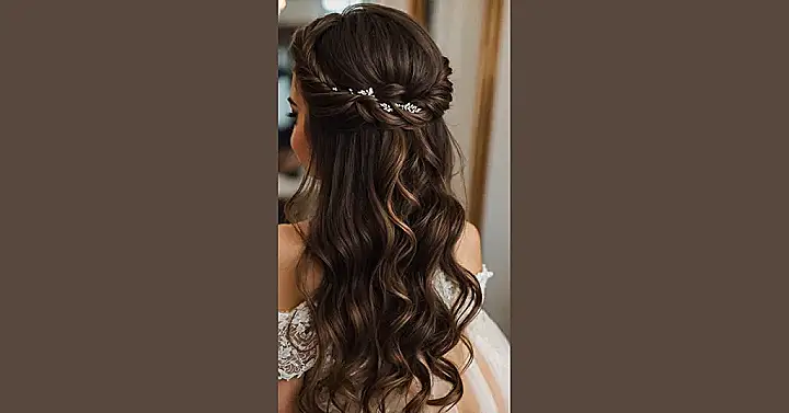 Look at this hair masterpiece! It’s got more twists and turns than a mystery novel, all braided up like a fancy bread loaf, but way prettier. Then it spills down into these perfect waves that probably took a team of hairstylists and a whole can of hairspray to create. You just know this hair is ready for its close-up, ready to make an entrance whether you’re walking down an aisle or just trying to find your seat at a fancy party.