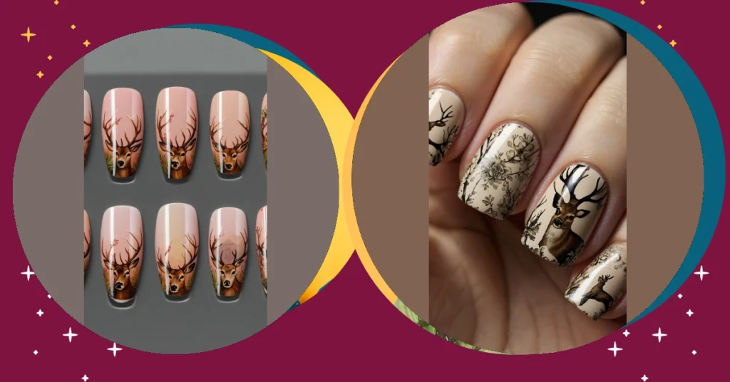 Now, let’s bring color into the mix. Whether you imagine rich shades of tan and beige reminiscent of a forest floor or soft nude tones that whisper elegance, there’s a deer print style that’ll tickle your fancy. And if you’re feeling a bit festive for the upcoming holidays, why not throw in some glitter, gems, or even holiday colors? Prepare for jaws to drop as those nails shine brighter than the holiday lights!