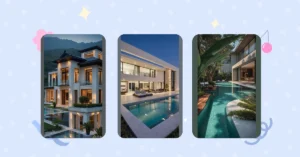See those awesome balconies? One looks perfect for dramatic entrances (or just checking if the pizza delivery guy has arrived), and the other’s great for quiet moments, like plotting world domination or, more realistically, scrolling through TikTok. The interior lights spill out so warmly, making the whole place feel like a giant, fancy hug, and there’s even a sleek water feature reflecting it all like a giant, chill mirror. This isn’t just a house; it’s a multi-level hangout zone where every corner is Instagram-ready, and your parents might even let you have friends over without it looking like a cave!