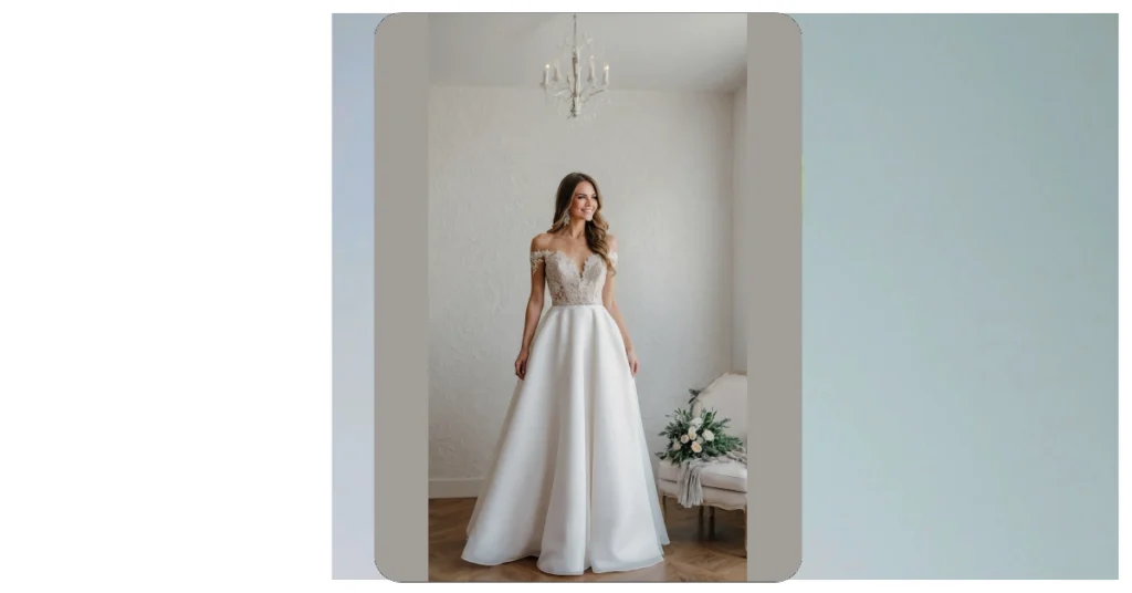 Planning a Christmas wedding means you get to combine all the holiday cheer with the biggest party of your life! Your guests won’t even need extra decorations – the entire venue will already be twinkling with lights. And if you’re worried about your beautiful train getting snow on it, just pretend it’s part of the winter magic, or maybe even a built-in snowplow for a dramatic entrance. This dress, with its delicate off-the-shoulder design, would totally rock a cozy fur stole if things get chilly, proving you can be both festive and fabulous without turning into a giant candy cane.