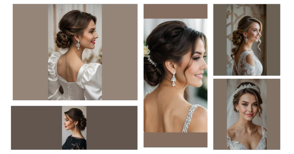And let’s be real, an updo like this isn’t just about the hair; it’s about the whole vibe! Paired with those mega-watt sparkly earrings that practically have their own zip code and a dress that looks like it was made from spun moonlight, you’re basically channeling your inner celebrity. This classic wedding look is all about feeling confident and gorgeous, without having to stress about whether your hair can survive an entire day of photos, hugs, and maybe even a surprise chicken dance. It’s like saying, “Yep, I woke up like this… with a little help from a hair stylist and a whole lot of hairspray!”