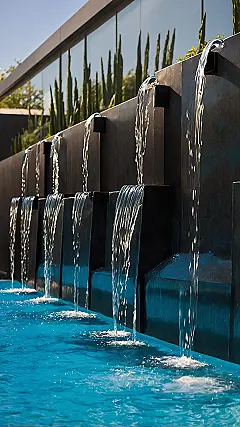 These outdoor wall fountains are like your wall decided to become a superstar, complete with its own personal water show! Forget boring brick or stucco; this wall is basically hosting a tiny, elegant waterfall concert, with each spout taking its turn to send shimmery streams into the bright blue water below. It’s so sleek and cool, you half expect the water to start doing synchronized swimming routines. Talk about a glow-up for your outdoor space – it’s instantly transformed from ‘just a yard’ to ‘my own private, bubbly oasis’.