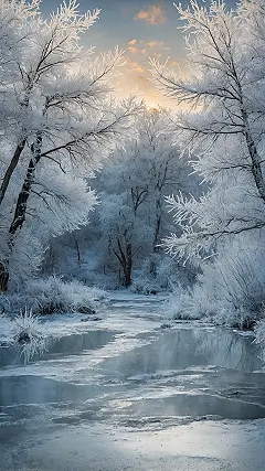 This picture is so frosty, it practically gives you brain freeze just by looking at it! It’s like the entire landscape decided to dress up as a giant, sparkly ice sculpture, and honestly, the trees are rocking that winter white look. The ground is covered in what looks like super-fluffy, crunchy sugar crystals, making you want to crunch through it – though maybe from a safe, warm distance. It’s the perfect scene to plop onto your phone or computer screen, instantly upgrading your digital space with a cool vibe without you needing to put on a single extra sweater.