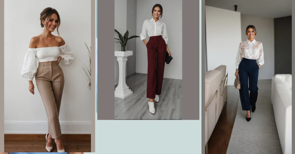 Check out this awesome outfit that proves “women trousers outfits” are anything but boring! This look is totally slaying, from the crisp, tailored trousers to that fantastic off-the-shoulder top. Those puffy sleeves are like little fashion clouds, ready to float you through your day, whether you’re trying to nail a presentation or just looking to sneak another cookie. It’s the kind of outfit that says, “Yes, I’m responsible, but I also know how to have a really good time and look great doing it!”