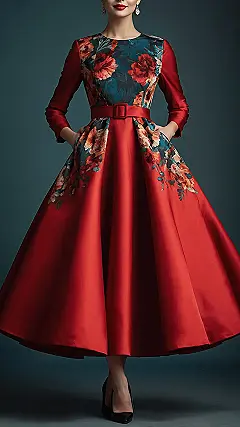 Getting ready for a party in a dress like this means you’re not just wearing clothes, you’re wearing a whole vibe. This snazzy red number with those awesome floral patterns looks ready to crash any dull room and turn it into a dance floor. It’s the kind of women’s party dress that makes you feel like you could star in your own movie scene, maybe one where you make a grand entrance and everyone stops to stare (in a good way!). Plus, the long skirt looks perfect for dramatic twirls, just try not to knock anything over.