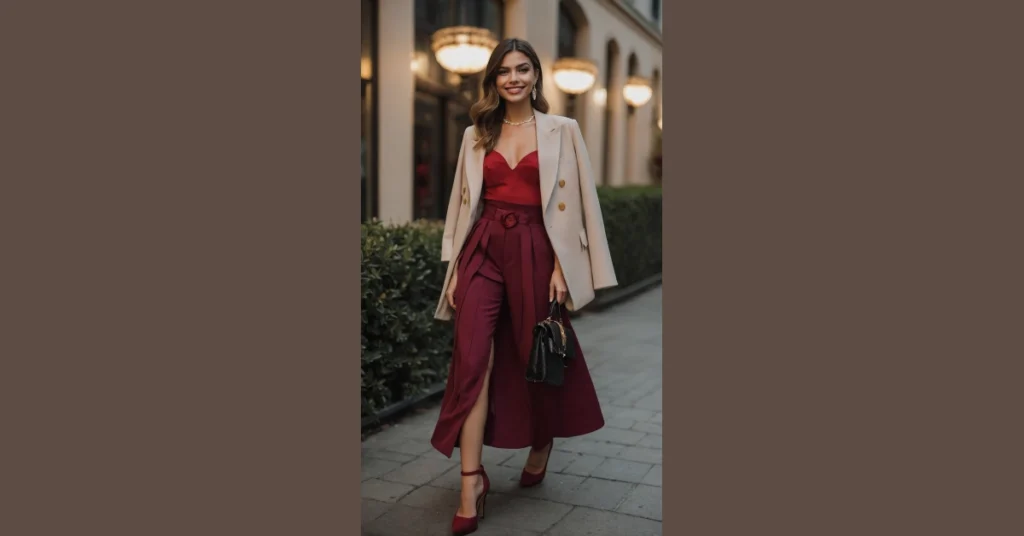 Finding the perfect holiday party outfit can feel like a mission impossible, right? You want to look good, but also not like you tried *too* hard (even if you totally did). Well, this vibe right here is serving up some major inspo! With those rich, festive red pants and matching top, it’s like saying, “I came to party, but also I’m super comfortable and maybe just a little bit mysterious.” No awkward dress tugging needed when you’ve got these flowy beauties!