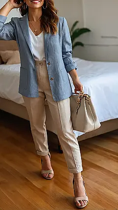 But hey, linen pants aren’t just for lounging! You can totally level them up, like adding that sharp blazer in the picture. Suddenly, you go from ‘I just woke up’ to ‘I woke up like this… and then added a blazer and cool shoes.’ It’s like a style superpower. Add some fun shoes, grab a cute bag, and bam! You’ve got an outfit that says ‘I’m chill, but I also know how to put myself together.’ Perfect for when you need to look decent but still want to breathe.