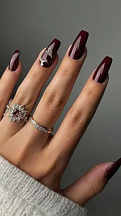 These nails are like a fancy party in a bottle! Imagine a sophisticated vampire who loves glitter – that’s the vibe we’re getting here. The deep, rich burgundy is super classy, like something you’d see on a red carpet, but that sparkly accent nail adds a fun, unexpected twist. It’s totally glam, but not so over-the-top that you’d be afraid to wear it to school or hang out with friends.