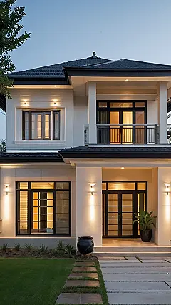Imagine a house so neat and tidy, it practically cleans itself! That’s what we’re talking about with sleek minimalist homes. Check out that entrance – no crazy decorations, just a cool wooden door, some plants that don’t require a ton of attention, and a walkway that looks like a zen garden for your feet. You wouldn’t find your parents tripping over forgotten toys here.