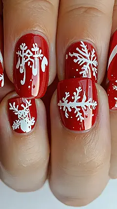These nails are seriously festive! Imagine walking into your holiday party with these beauties. It’s like wearing tiny, adorable Christmas ornaments on your fingertips. The red is so classic and the little white snowflakes and reindeer are just the right amount of cute – not too much, not too little. They’re simple enough for everyday wear, but fancy enough to impress your grandma.