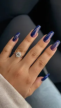 Those nails are giving major fall vibes! That deep blue is like the color of a crisp autumn sky and those long, elegant shapes are like the leaves falling from the trees. Plus, with that sparkly ring, it’s like your fingers are ready for a fancy pumpkin spice latte (or maybe even a hot chocolate – no judgment here!)