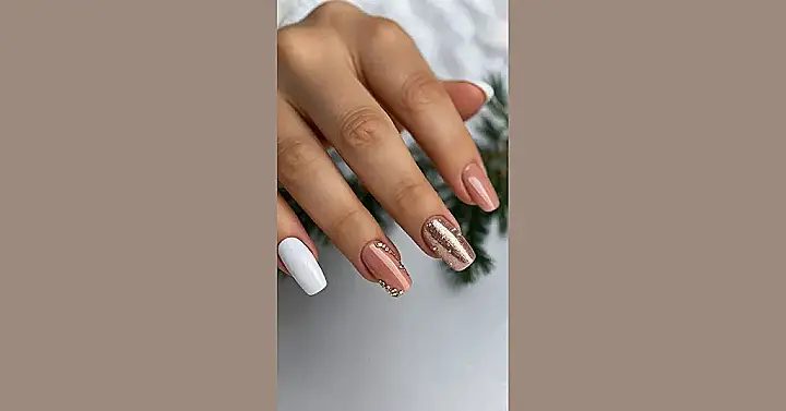 Seriously, how cute are these? They’re the perfect blend of sophisticated and playful. The glittery gold nail is like a tiny disco ball, ready for the New Year’s Eve party, while the peachy nude and white nails give it that subtle, elegant touch. It’s like your nails decided to celebrate the holidays with a super stylish and understated party! No need for reindeer antlers here – these nails are the ultimate winter accessory.