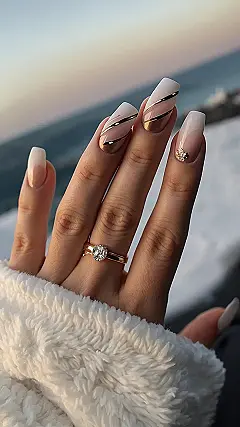 These nails are seriously giving us major fall vibes! The soft, nude base with the glittery ombre is like a cozy sweater on your fingertips, and the gold accents are like a touch of autumn leaves. Plus, let’s be honest, who doesn’t love a little bit of bling? These nails are perfect for a night out, a casual day, or even just lounging around in your fuzzy pajamas (because, let’s face it, we all do that sometimes). They’re stylish and sophisticated, but also have a playful edge that makes them totally fun.