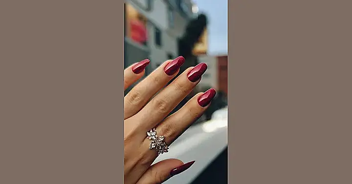 Those nails are seriously *fire*! That rich, deep red is perfect for fall, and it makes the sparkly ring look even more dazzling. Imagine walking around with these nails, feeling confident and stylish. You’ll be turning heads everywhere you go.