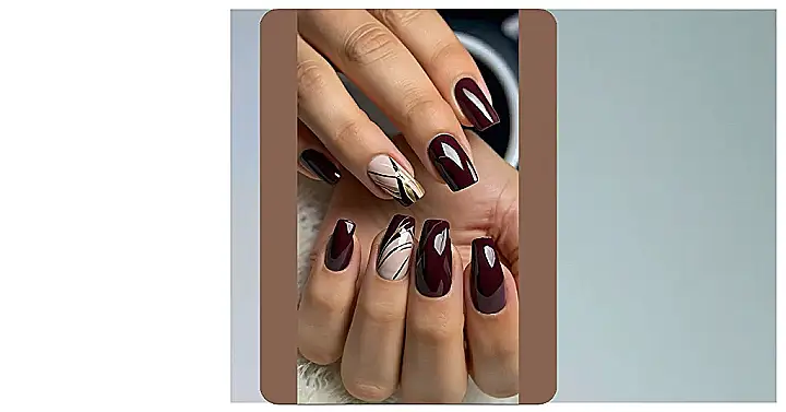 These nails are seriously next-level! It looks like someone raided a chocolate factory and decided to paint their nails with it. You’ve got some nails rocking a rich, dark chocolate color, and then BAM! Some have cool, artsy designs like abstract gold and black paint strokes on a light nude base. It’s like a fancy dessert for your hands, and who wouldn’t want that?