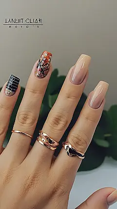 These nails are SO cute! They’re like a mini autumn forest on your fingers! It’s got all the fall vibes, with the brown, orange, and black colors, and the sparkly glitter is like the leaves falling down. The nail on the right is super simple and elegant, but the one on the left is like a mini masterpiece! It’s like having a little bit of fall fashion on your fingertips, and who doesn’t love that?