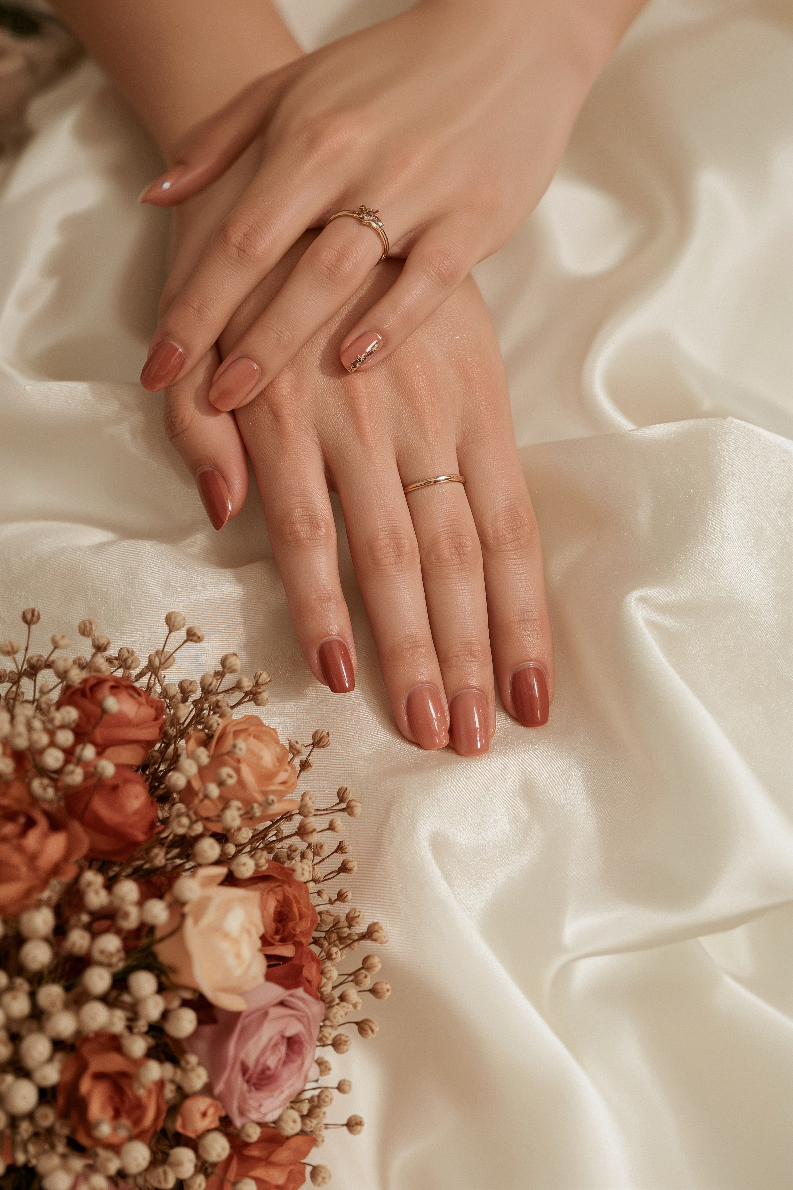 Think burnt sienna, terracotta, and peachy coral tones that create a modern yet romantic mood, proving that cute wedding ideas extend to the most delicate details of your fingertips.