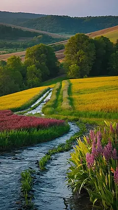 Now picture yourself standing right at the edge of the stream, the soft current whispering secrets against the riverbed. You can feel the coolness of the water on your feet and smell the sweet scent of wildflowers growing nearby. It’s so peaceful and quiet, the only sound being the gentle rustling of leaves and the distant chirping of birds. This is a place where you can forget about your worries and just breathe. It’s like stepping into a painting, a moment of pure, relaxing beauty.