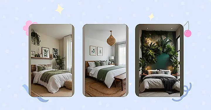 Imagine waking up and thinking you’re in a super stylish jungle! This bedroom is packed with nature’s greatest hits. There’s a chill green sofa that screams, “Come relax!” and enough plants to make your allergies go wild (but in a good way, because it looks awesome). The tree mural on the wall gives it that extra “wow” factor.