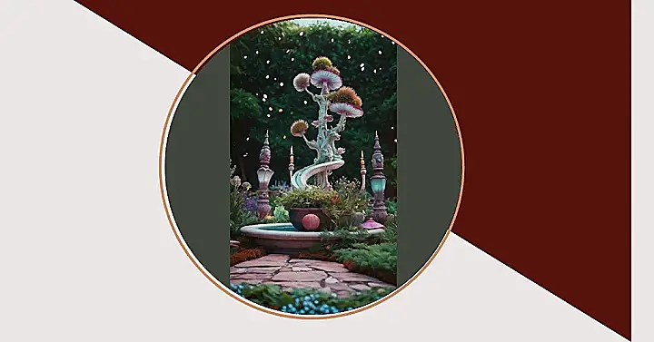 This whimsical garden is like something out of a fairytale! Imagine strolling through a secret path, only to stumble upon this magical scene. Those strange, flower-like plants with their big, pink petals are the real stars of the show. They look like giant, friendly mushrooms that could take you on a magical journey! The little fountain is perfect for taking a refreshing drink, and the stone path leading to the fountain is just waiting to be explored.