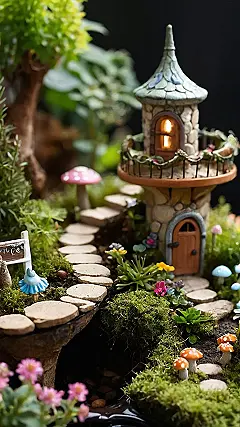 Imagine shrinking down and wandering into this tiny town! The mushroom tables are set for tea, and that mossy-roofed house looks super cozy. It’s like a hobbit house but with way more charm and probably fewer second breakfasts. Who knew all you needed for a magical escape was a few pebbles, some moss, and a serious dedication to miniature furniture?