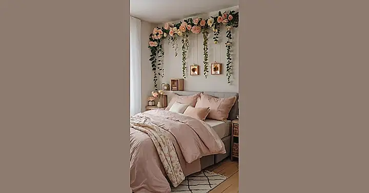 Seriously though, check out those delicate peach roses and the trailing greenery. It’s so calming and pretty, it’s almost unfair. And the best part? It’s not just pretty; it’s practical too. Who needs a boring old headboard when you can have a blossoming masterpiece? Plus, those little framed pictures hanging amongst the vines are a clever touch—they add a personalized detail without overshadowing the amazing flower power. It’s like the room’s saying “Hello, gorgeous, and welcome to paradise!” If this doesn’t inspire you to add some floral flair to your own space, I don’t know what will!