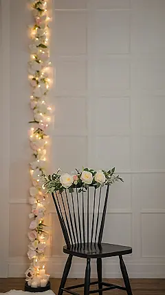 This picture is seriously goals! Just imagine: you walk into your room, and BAM! A gorgeous black chair is decked out like a floral queen, with pretty white and pink roses, all nestled in among its spindles. It’s like a throne fit for a flower fairy! And that magical string of lights and flowers snaking down the wall? Totally adds to the dreamy, aesthetic vibe. You’d instantly want to grab a good book, cozy up, and snap some pics for your Insta feed.