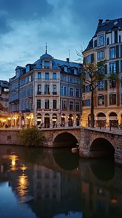 This image is like a postcard from a fairytale! Imagine strolling along the cobblestone streets of a charming European town. The buildings are all old and beautiful, with windows that look like they’re straight out of a storybook. The bridge is the perfect place to stop and admire the view, especially with the gentle reflection of the lights in the water. It’s like stepping into a scene from a movie, except you’re actually there, and it’s real!
