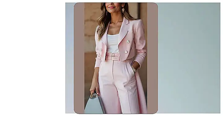 This outfit is totally rocking the “pink women outfits” vibe, but with a grown-up twist! It’s like a boss lady’s take on a pajama party. Imagine walking into school with this— heads would turn! The creamy white pantsuit is super chic, and that sweet pink belt and shoes? They’re the perfect pop of color, like adding sprinkles to your favorite cupcake. Who needs a boring uniform when you can rock this amazing, confident look?