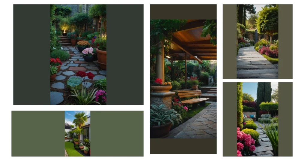 This garden is like a secret escape! Just imagine yourself taking a stroll on that stone path, feeling the soft grass between your toes. There’s a comfy bench with colorful pillows waiting for you, and the whole place is bursting with vibrant flowers. It’s like stepping into a painting, but better because you can actually smell the sweet scent of blooming roses and feel the gentle breeze rustling through the leaves.