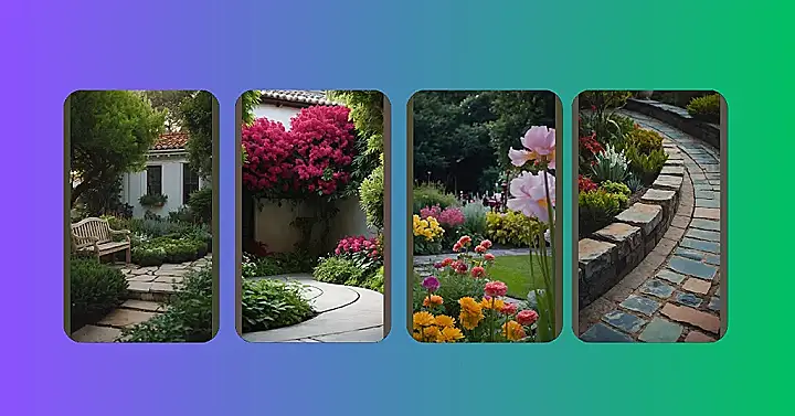 This garden looks like a party for your eyes! It’s bursting with color, from the bright reds and pinks to the soft purples and oranges. It’s like someone took all the prettiest flowers and just threw them together, and luckily it worked out beautifully. There’s a big, green bush in the middle that’s just chillin’, watching all the flowers have a good time. This garden is like a big hug for your soul, full of sunshine and joy.