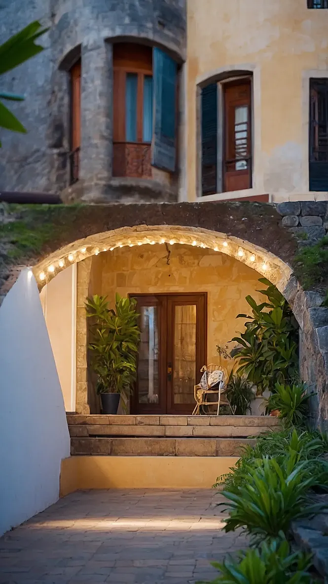 This picture is like a scene straight out of a European fairytale! It’s got charming stone walls, a cozy little doorway, and a comfy chair just begging for you to sit and relax. Can you picture yourself enjoying a cup of coffee on that porch, watching the sun set over the European countryside? The string lights twinkling overhead add a touch of magic, reminding me of those cute cafes you see in movies.
