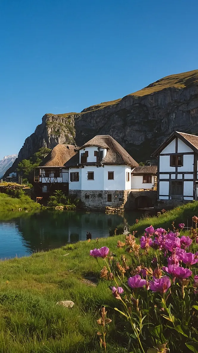 This picture is like a scene straight out of a fairytale! Imagine yourself wandering through a quaint village in the heart of Europe. You might find yourself by a crystal-clear pond, surrounded by charming houses with thatched roofs. The air would be fresh and cool, filled with the scent of blooming flowers. It’s the kind of place where you could easily picture a friendly dragon hiding in the hills, or a mischievous gnome peeking out from behind a tree.