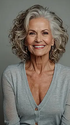 This woman’s got it going on! She’s rocking a hairstyle that’s like a delicious layered cake for her hair, with cool silver highlights that make her look super stylish. It’s definitely the kind of haircut that makes you want to say, “Wow, I want that!” And let’s not forget that fabulous smile! It’s so bright and cheerful, it makes you feel good just looking at it. She’s a perfect example that age is just a number and being stylish is all about feeling confident and rocking what you got!