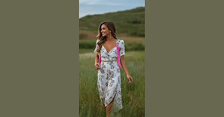 Seriously, who knew flowers could be so cool? This outfit’s got that “effortlessly chic” vibe going on, you know, the kind that makes you look amazing without even trying too hard. It’s like the dress is whispering, “I’m romantic, but I also know how to have a good time!” The flowing fabric and the pretty floral pattern are all about romance, but the whole look is so fresh and modern that it’s anything but stuffy. It’s the kind of style that makes you want to grab your friends and go on an adventure โ maybe a picnic in the park, followed by an ice cream social.