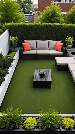 The best part? No mowing or watering! This fake grass is perfect for those who don’t have a green thumb (or the time to tend to a real lawn). It’s like having a luxurious, low-maintenance escape right at home. Just grab a good book, a cool drink, and get ready to relax. Life is good, especially when you have a rooftop patio like this!